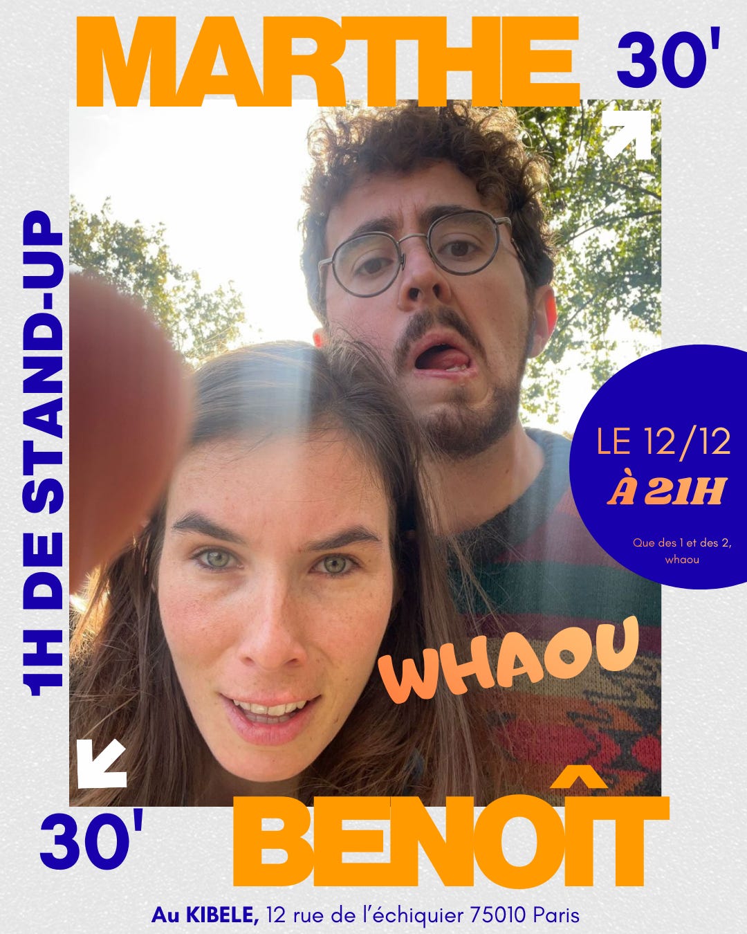 C’est à dire qu’avec Marthe, qui fait aussi du stand-up, on fait chacun.e 30 min de notre spectacle à 21h au Kibélé. Ca va être spectaculaire.